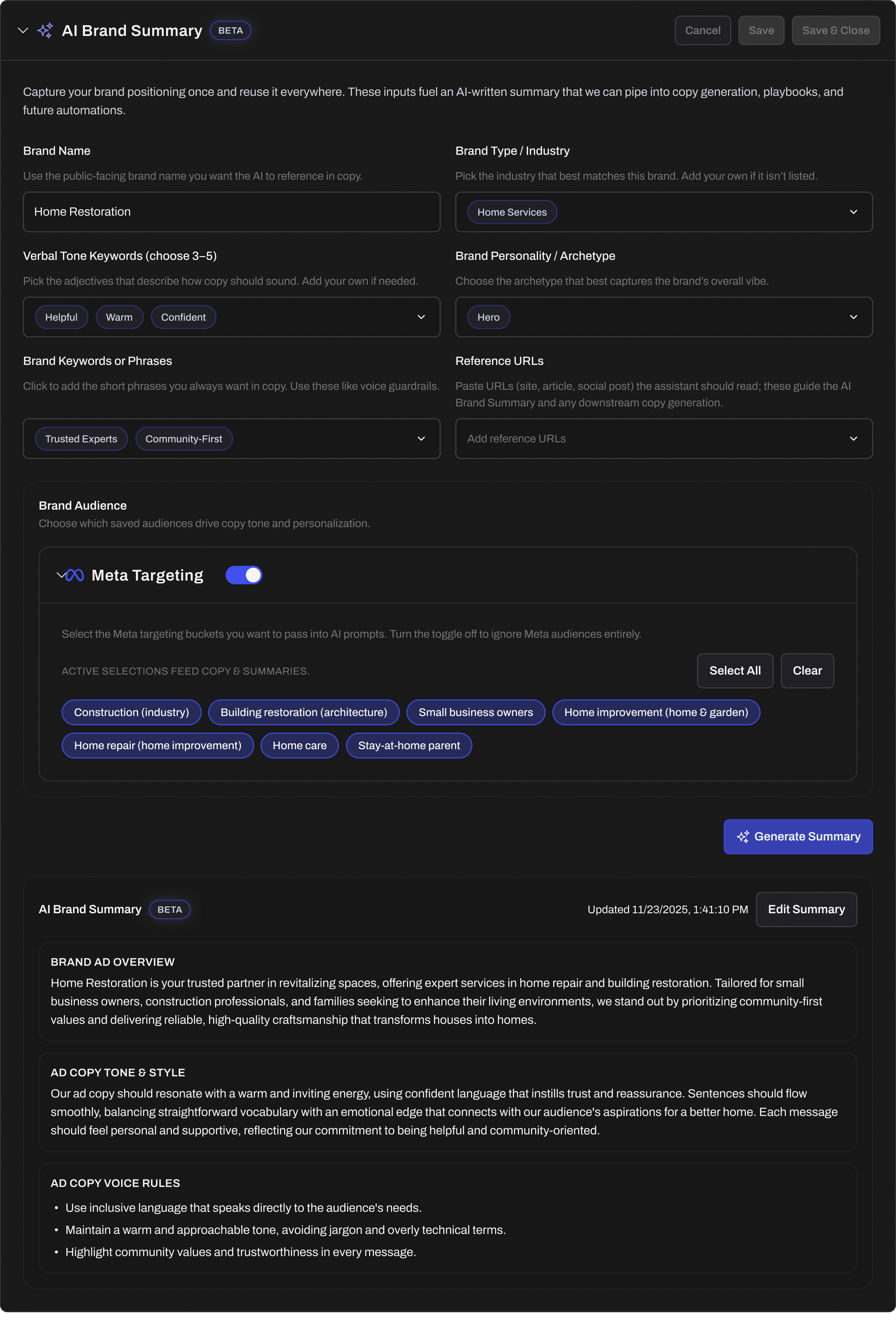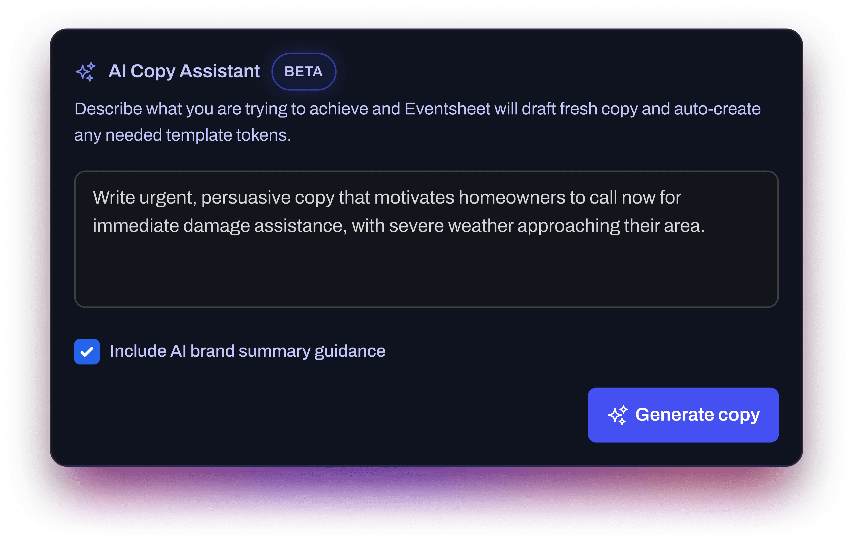 In a few clicks, Eventsheet turns your brand, audiences, and offers into on-brand ad variations so you can test faster, scale what works, and stop wasting time manually building campaigns.